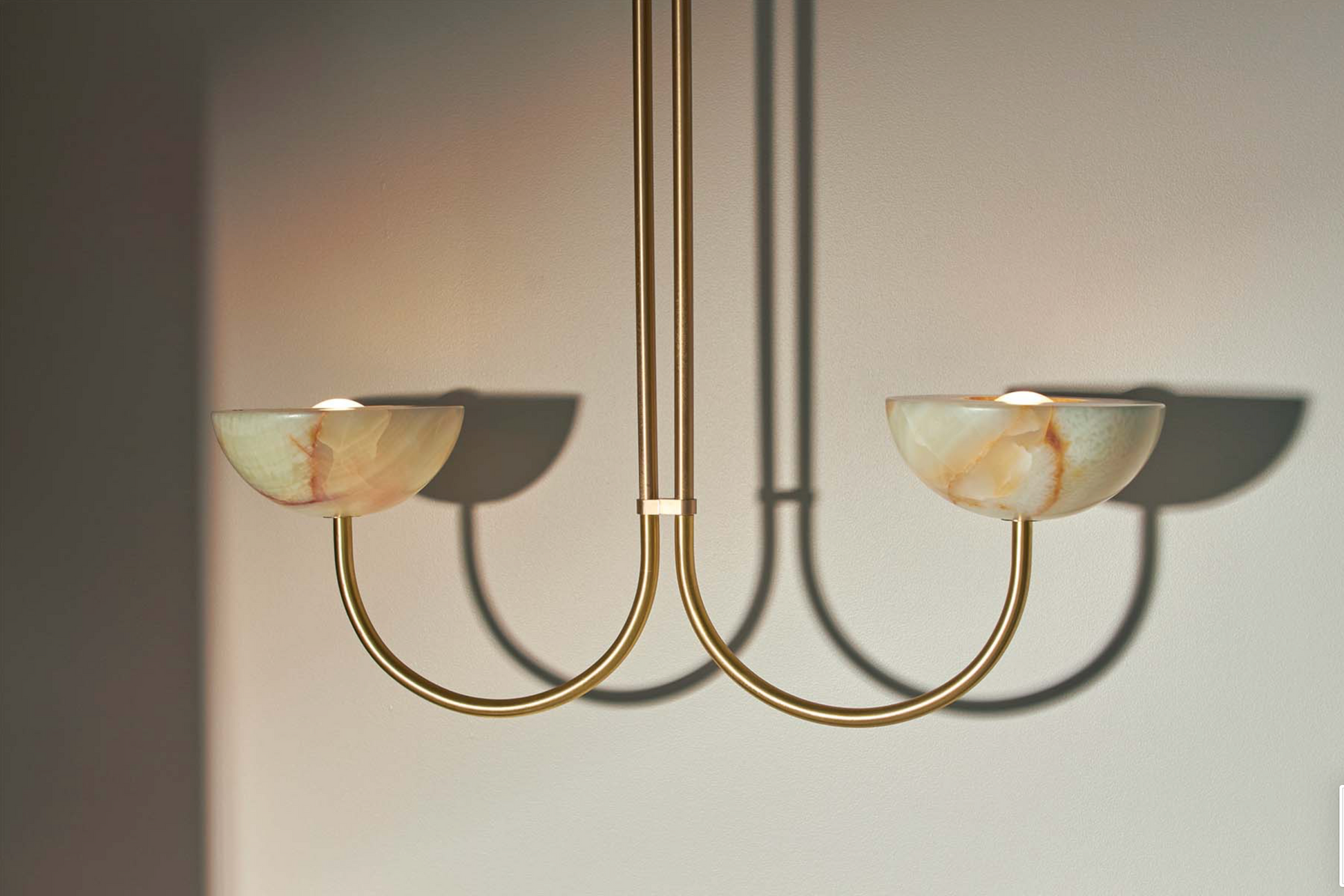 Available in small and large sizes in white or jade onyx, the Aurelia Double Pendant forms part of a new celestial range of residential and commercial lighting. Defined by soft balance and symmetry, this dual-light source combines contemporary and classic parts through a chandelier-style design.