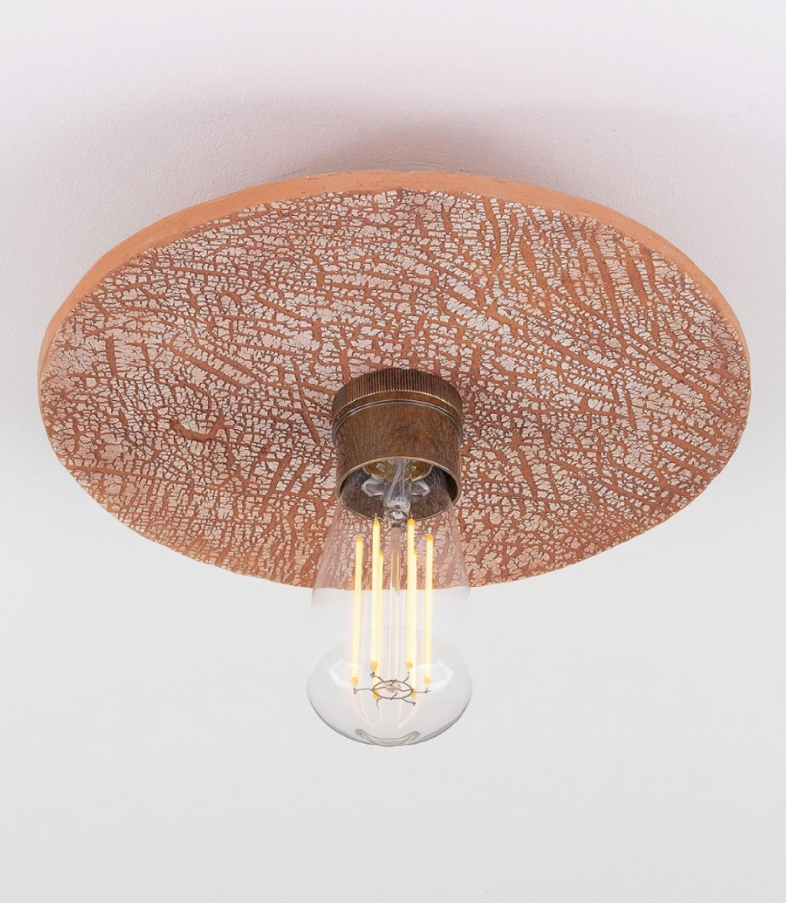 The rustic Red Iron colour finish is an inspiring blend of rust and terracotta hues that beautifully reveal the ceramic shade's coarse, crackled surface. This pattern is crafted by hand in our ceramic studio in Mullan Village and resembles the bark of a tree.