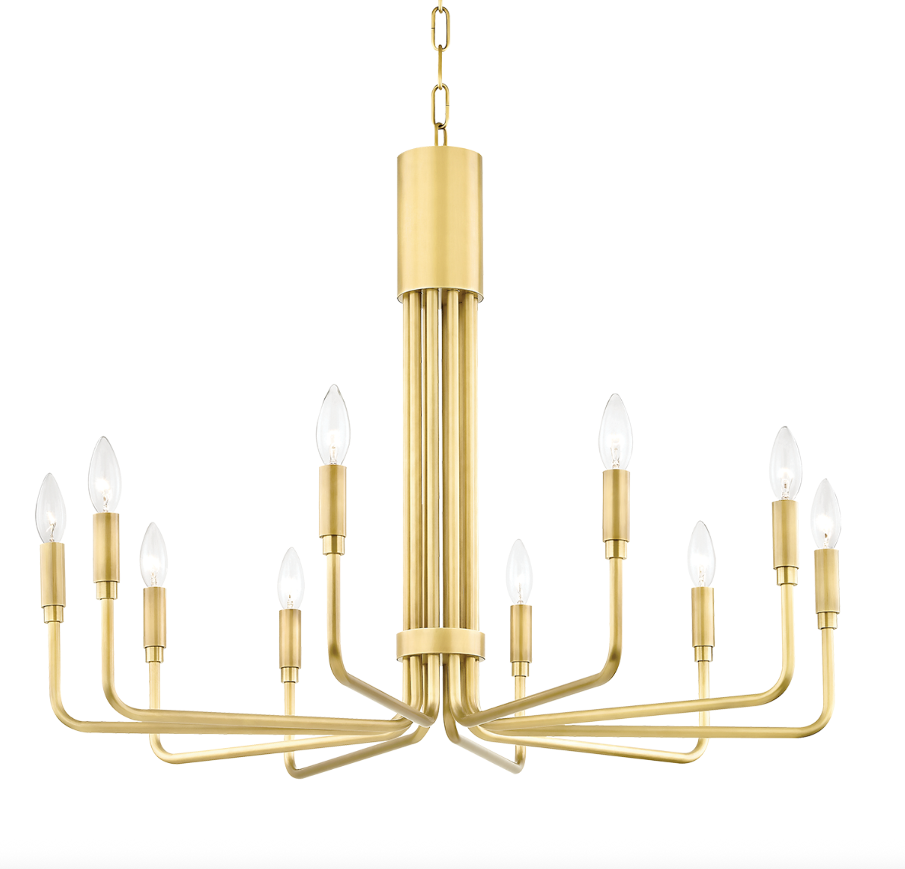 Brigitte Chandelier is an industrial take on the classic chandelier. Available in a 6-light and 10-light variation as well as two different finishes; aged brass and old bronze.