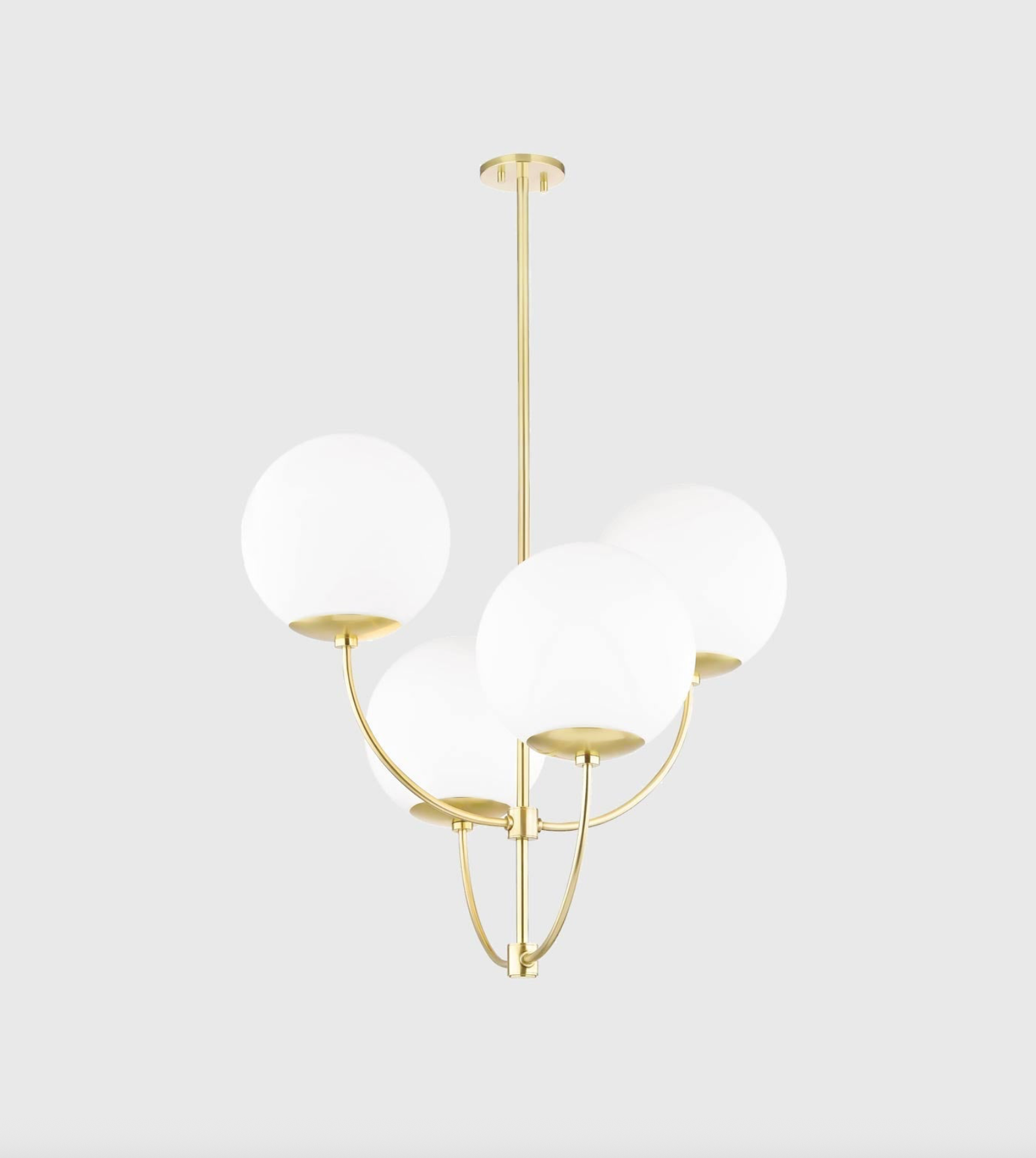Carrie Chandelier is a refined lighting fixture with sophistication in abundance. Elegant arms curve upwards from the central stem upon which are nestled perfect spheres of opal glass.