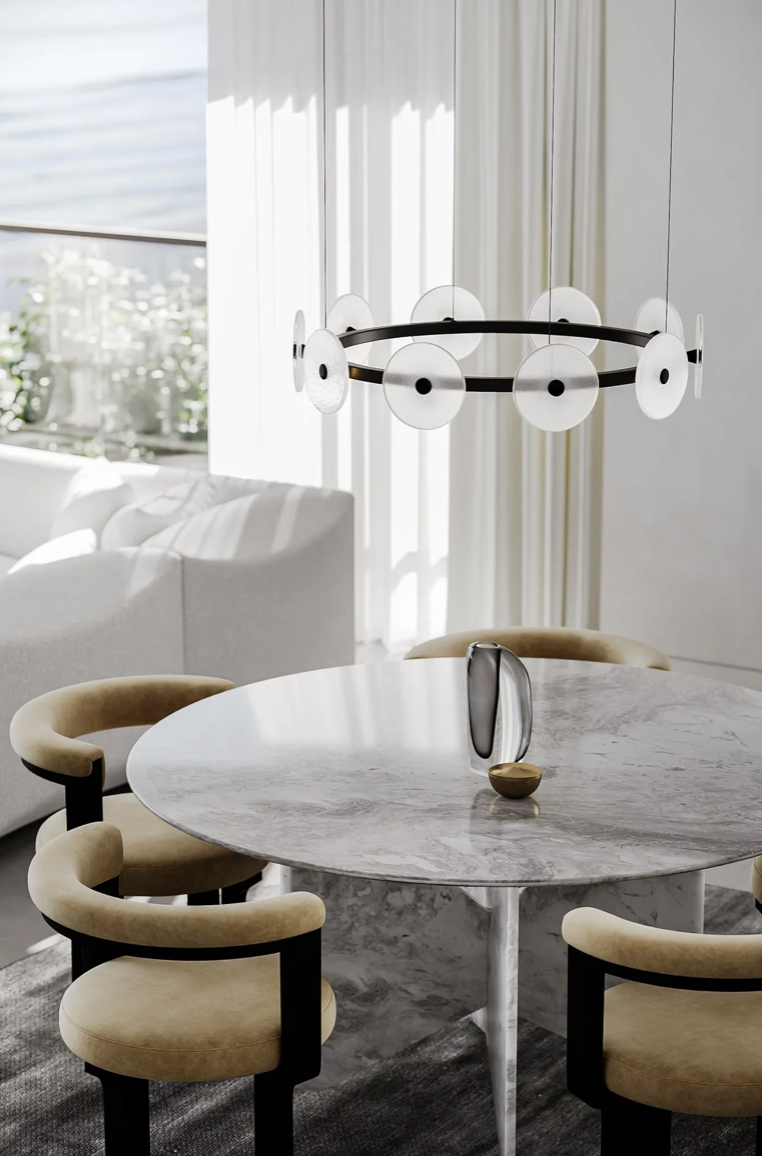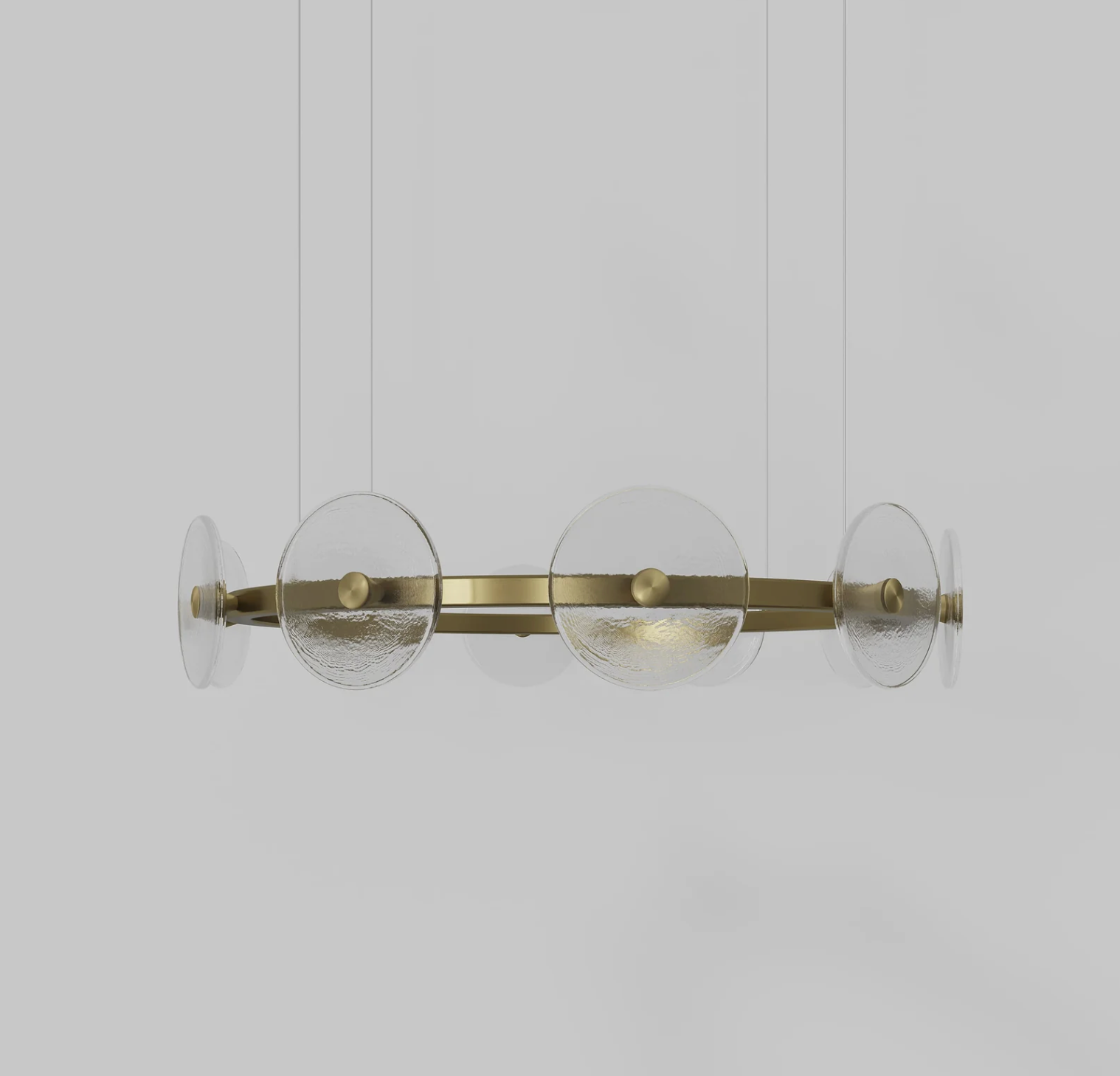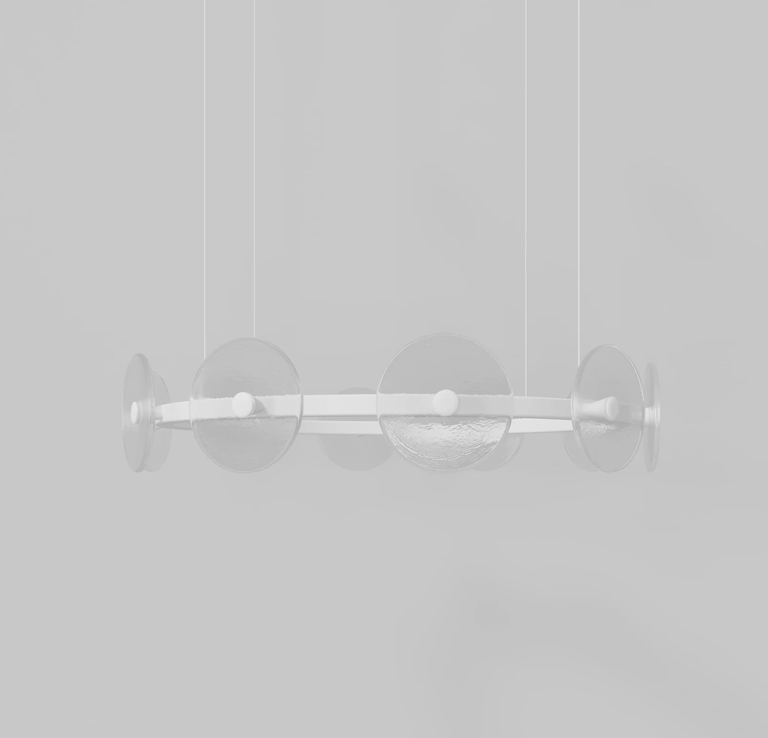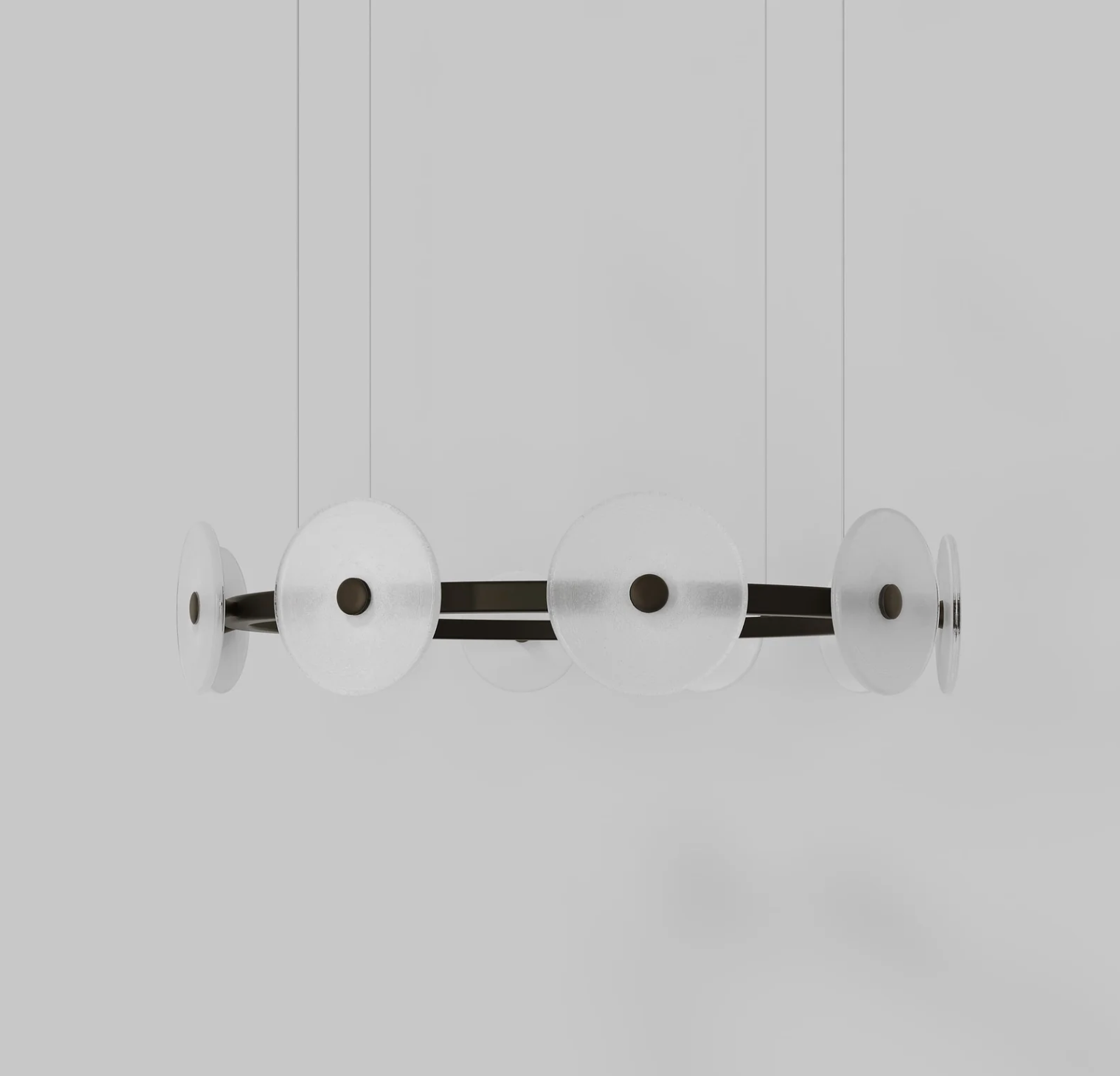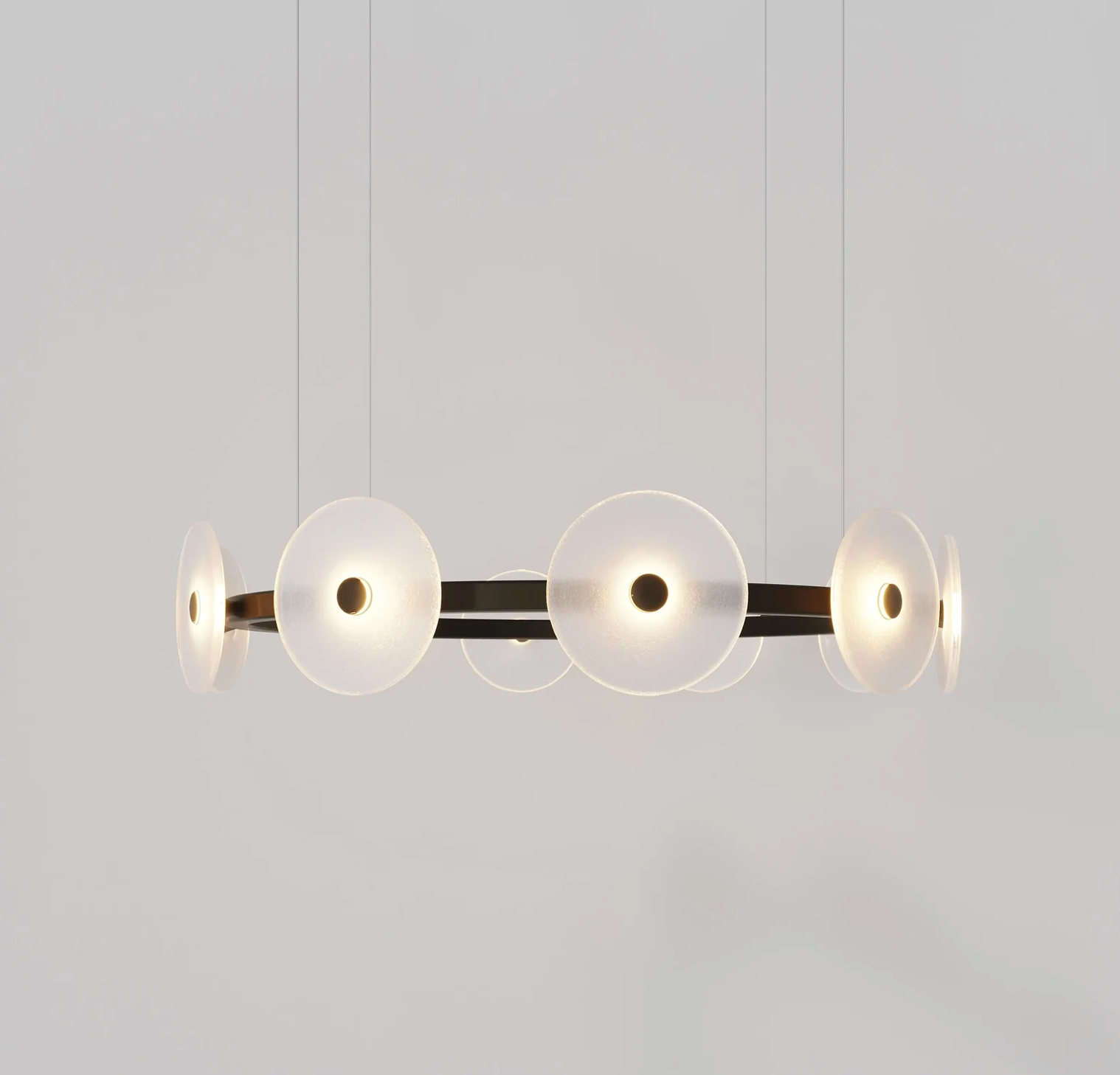 Adorn your space with the remarkable Coral Ring 10 pendant light. The circular ring base, available in a brass finish, matte black, matte white, and medium bronze finishes provides a striking canvas for the arrangement of ten individual hand-blown glass discs. This ring of modern art adds a distinctive touch of opulence to any space, particularly suited for hanging above dining tables, kitchen islands, or within an office space. Choose from a frosted or clear finish and set the mood of your space with a choice of warm, warm white, or white LED temperatures. Meticulously hand-blown using premium Swedish clear glass, each disc carries the distinctiveness of SOKTAS Glass designs, promising an unparalleled and personalised lighting masterpiece that adds both elegance and character to your space.
