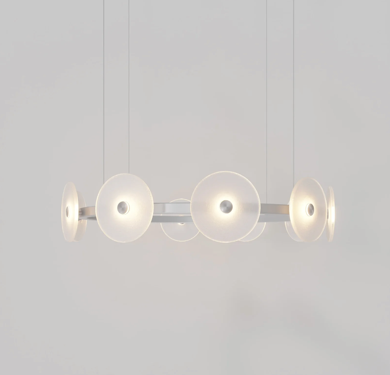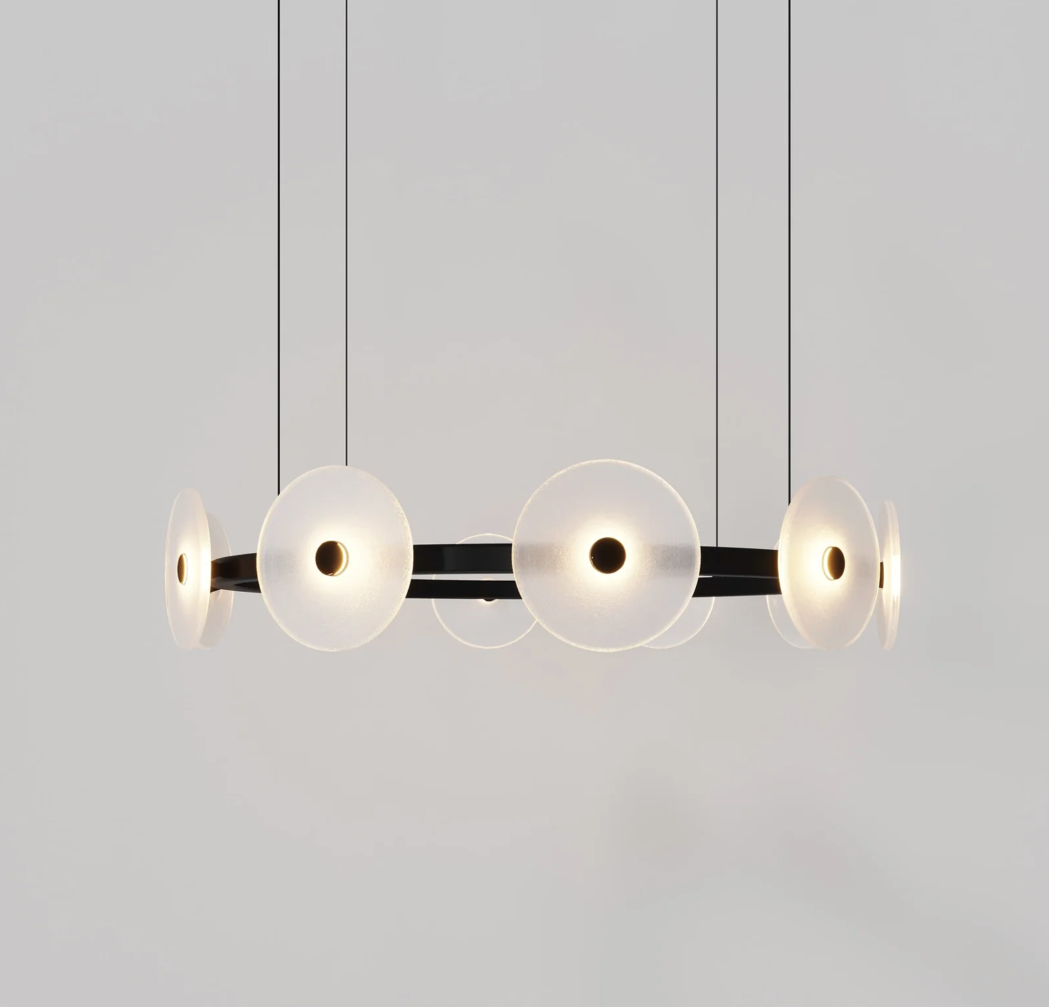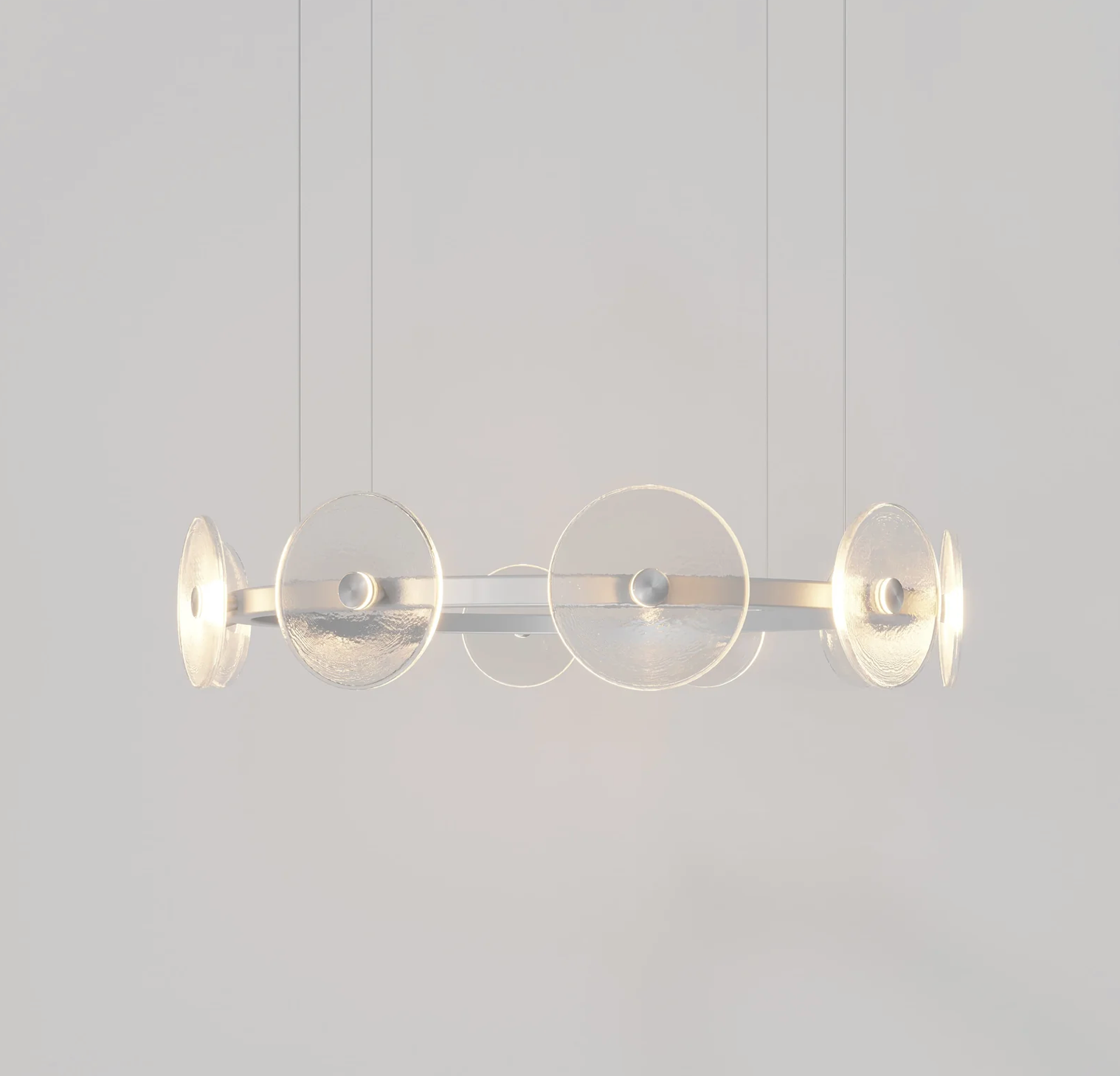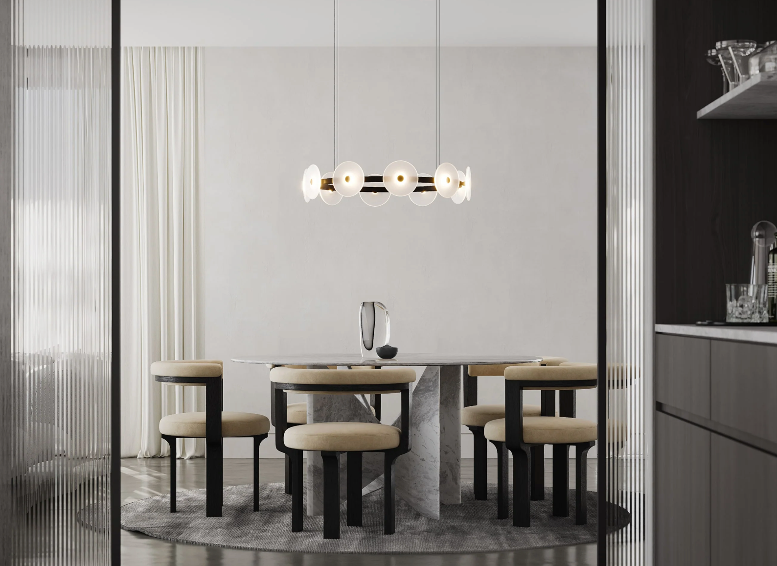 Adorn your space with the remarkable Coral Ring 10 pendant light. The circular ring base, available in a brass finish, matte black, matte white, and medium bronze finishes provides a striking canvas for the arrangement of ten individual hand-blown glass discs. This ring of modern art adds a distinctive touch of opulence to any space, particularly suited for hanging above dining tables, kitchen islands, or within an office space. Choose from a frosted or clear finish and set the mood of your space with a choice of warm, warm white, or white LED temperatures. Meticulously hand-blown using premium Swedish clear glass, each disc carries the distinctiveness of SOKTAS Glass designs, promising an unparalleled and personalised lighting masterpiece that adds both elegance and character to your space.