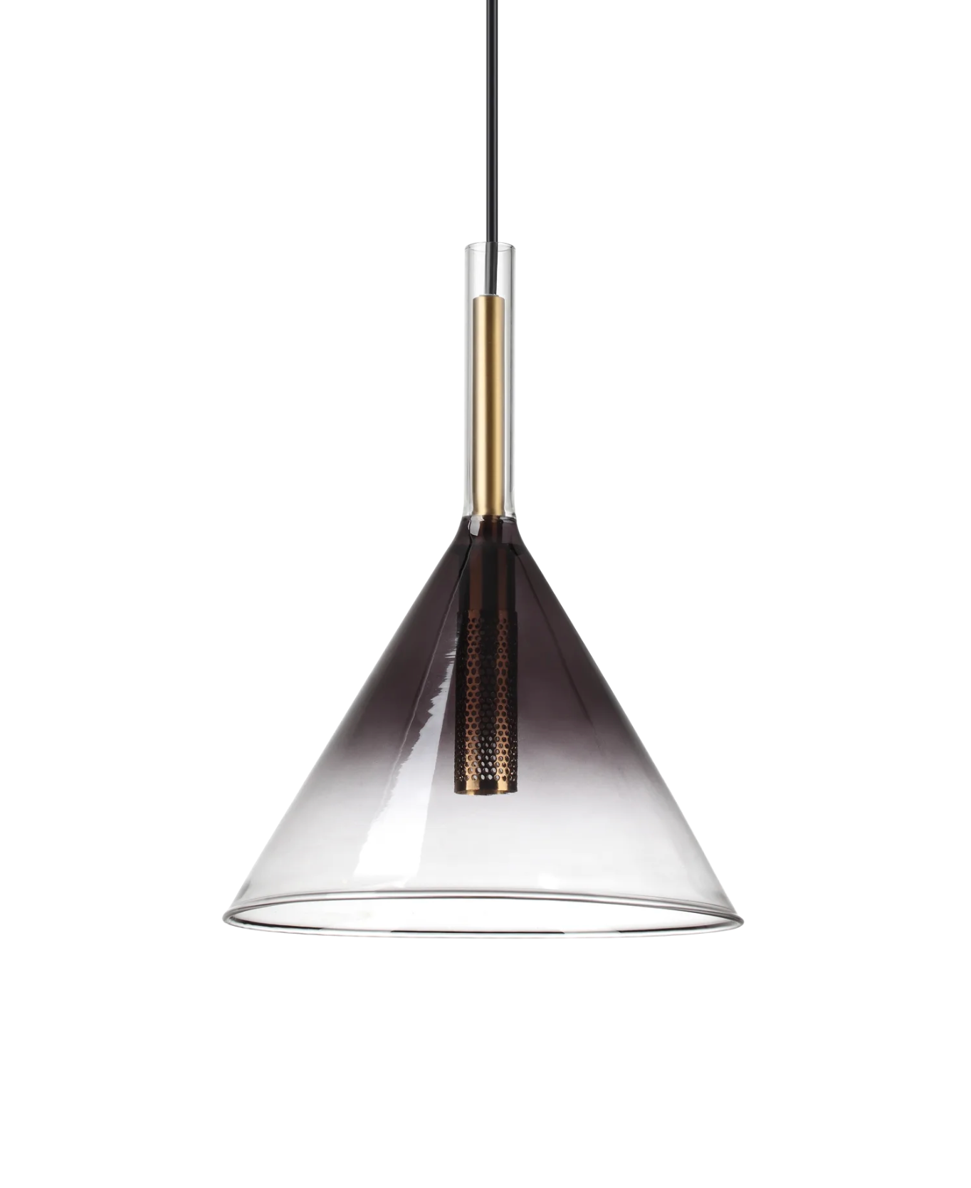 The Empire collection is available in three distinct shapes and sizes, Featuring a semi-smoked glass shade and perforated brass diffuser around the light source.