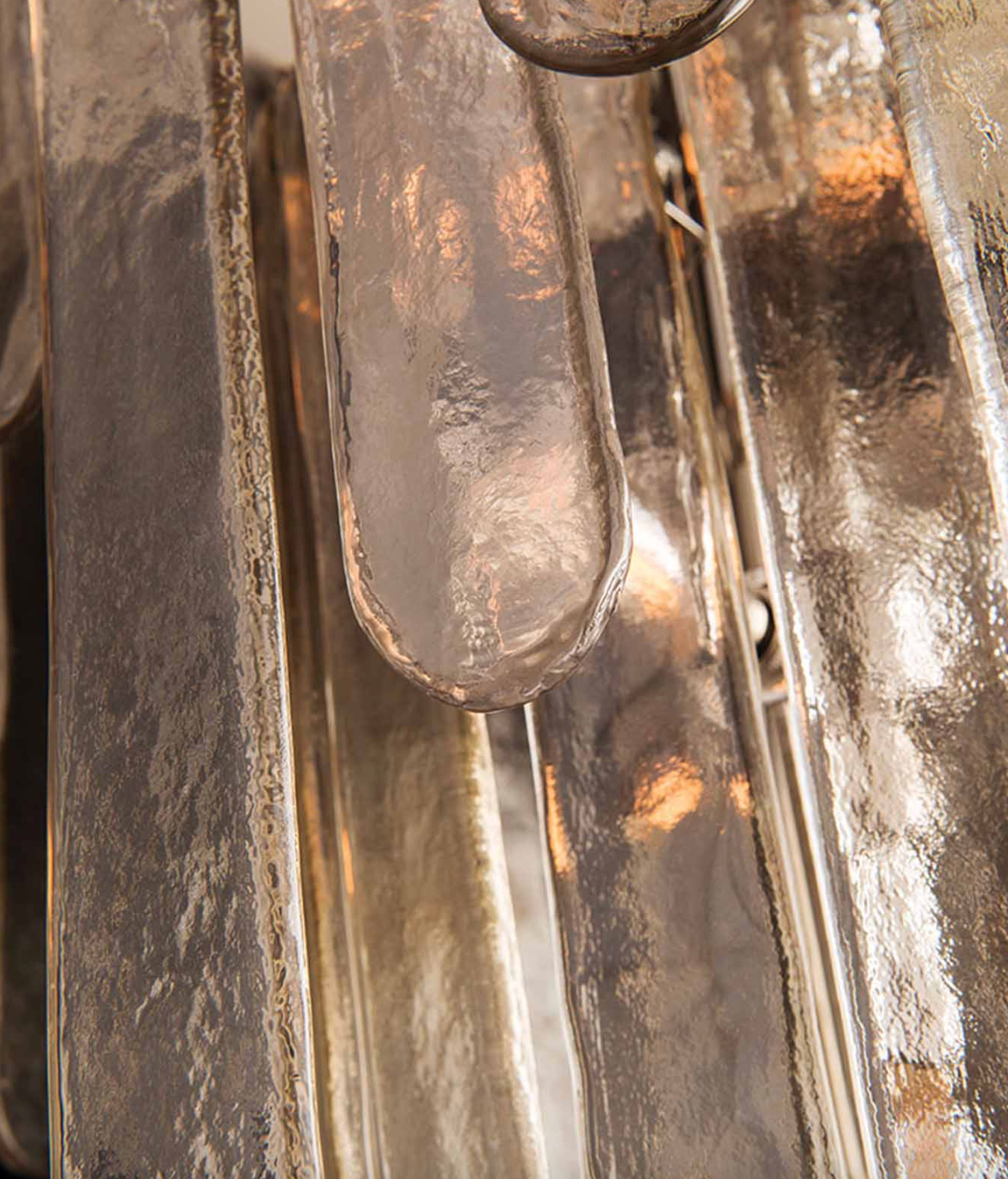 Fenwater 9lt Pendant Light features glass that is rough and champagne-hued to suggest a degree of antiquity. The hooked glass panels hang in a three-layered cascade in staggered lengths. The resulting appearance is at once warm and woozy, watery and icy.