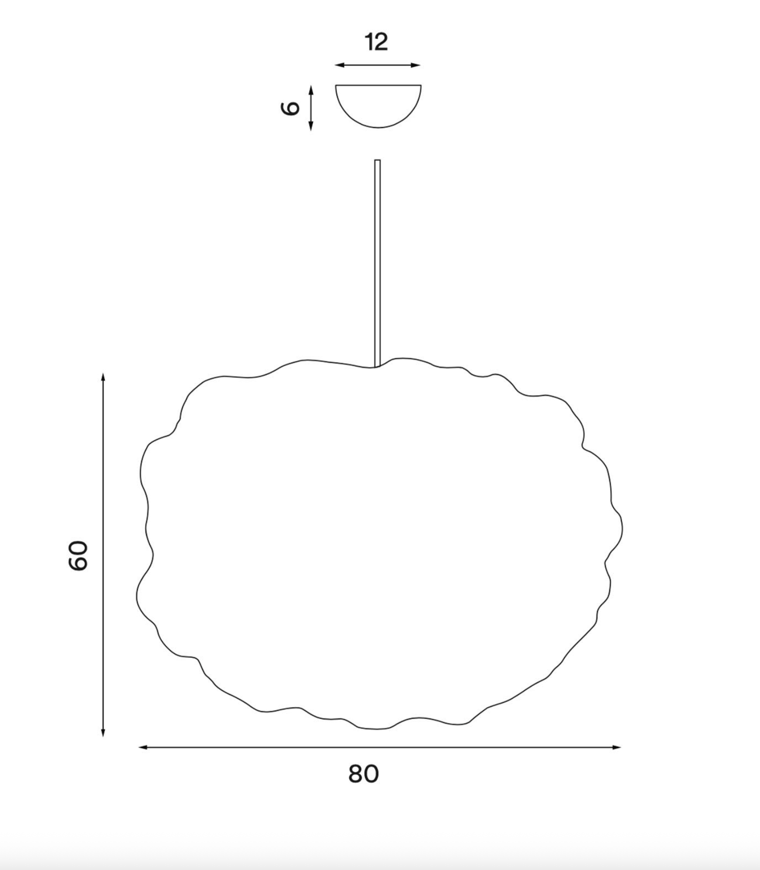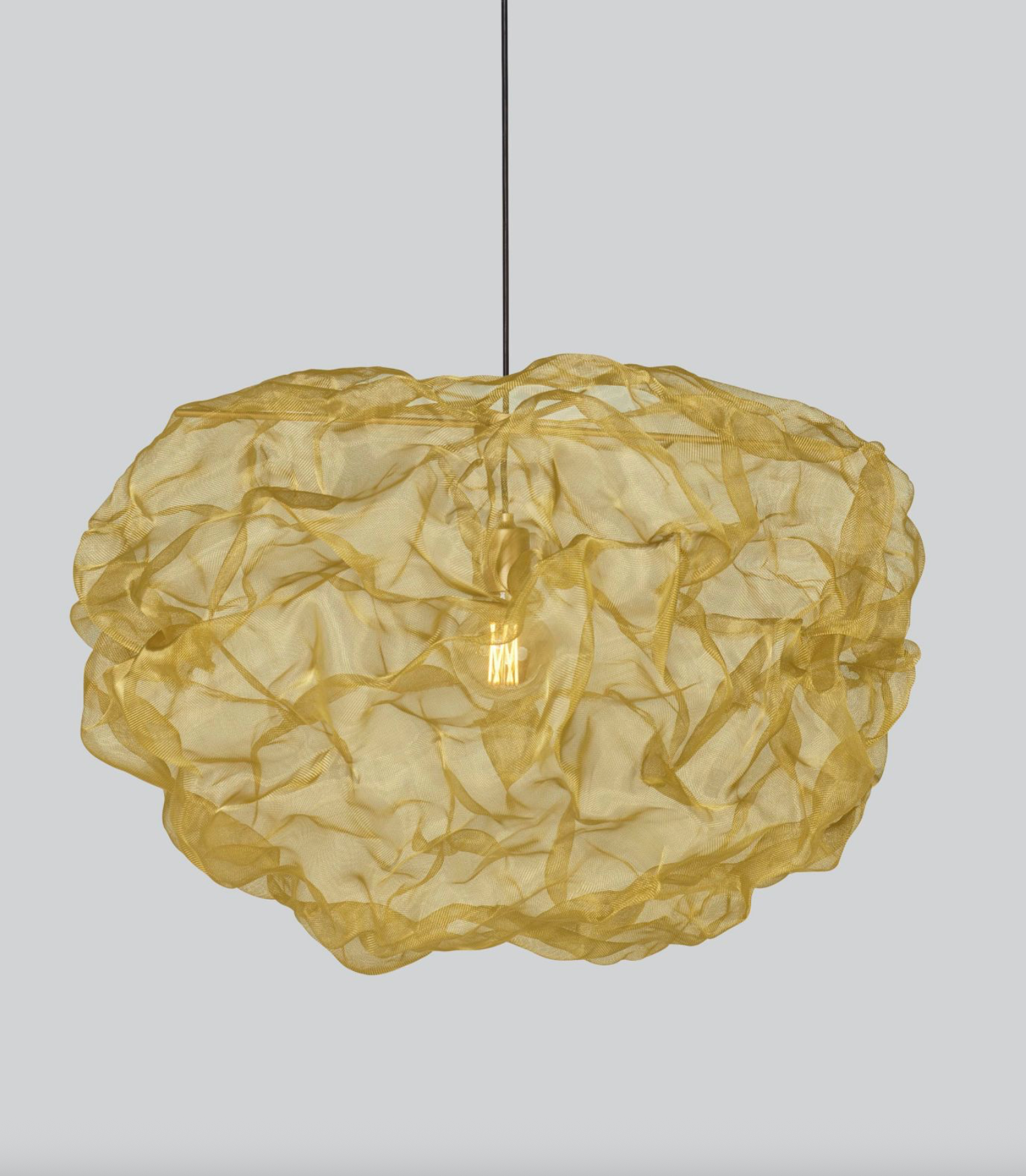 This interior pendant light appearance changes as the light source within it begin to glow. When the power is off, the shade’s semi-transparent shape resembles a silvery or brassy cloud hovering above the room.