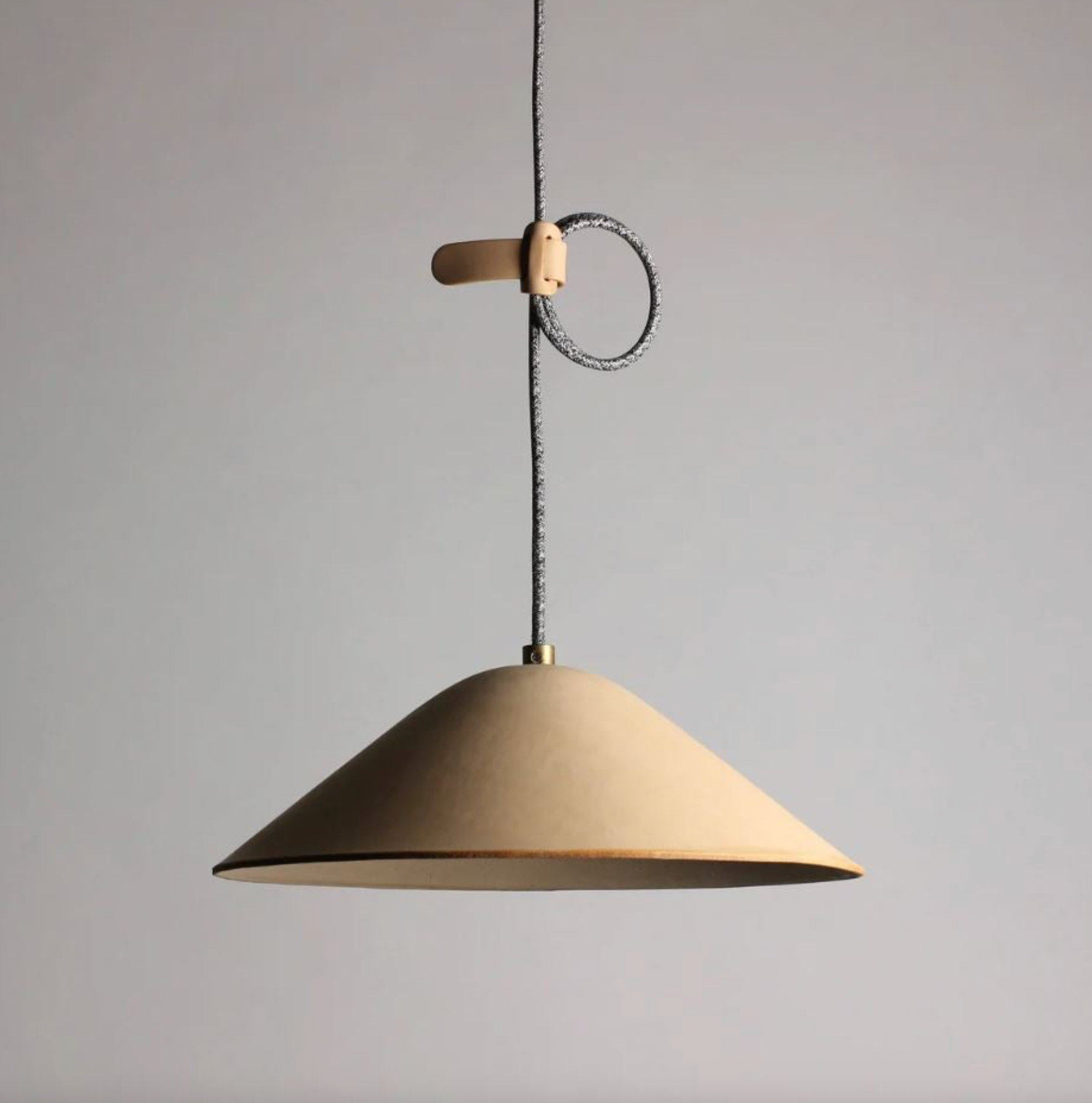 The Loop Pendant is our flagship product. A single piece of luxurious Australian vegetable-tanned full-grain leather, formed into shape using a custom made 20 tonne press and dried in place. Made with luxurious 4mm thick locally vegetable-tanned cow hide. With a leather tie, brass strain relief and grey linen cable. The inner of both the natural and the black is kept natural, and reflects a lovely soft light.