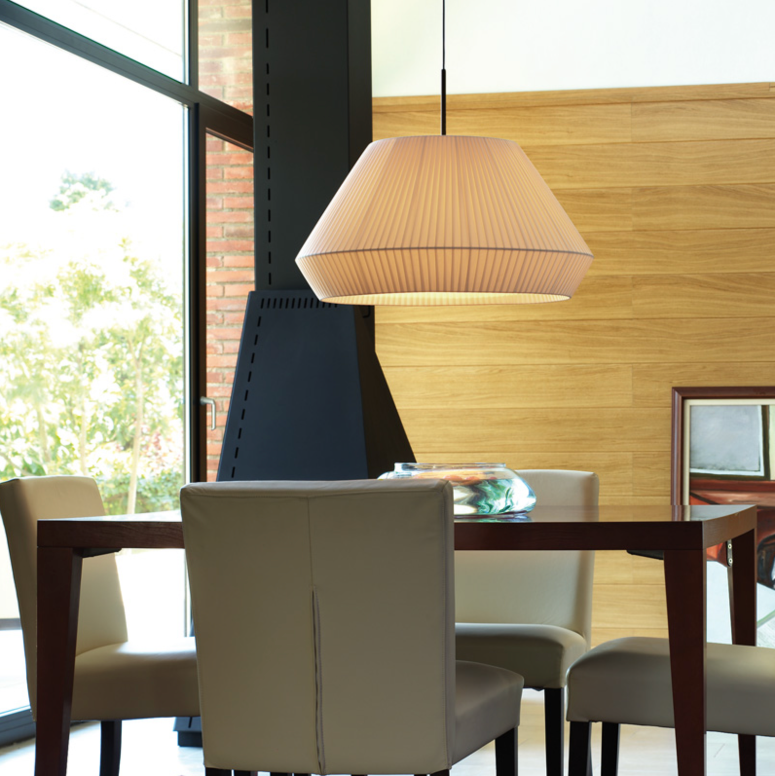 The MEI collection of pendant lights are entirely made at Bover, starting with the frame welding right down to the hand-woven ribbon shades. The design intent was to accentuate their width and volume, while still appearing light and airy, with large commercial and hospitality settings in mind. Available with white or cream ribbon. Also available in other sizes.