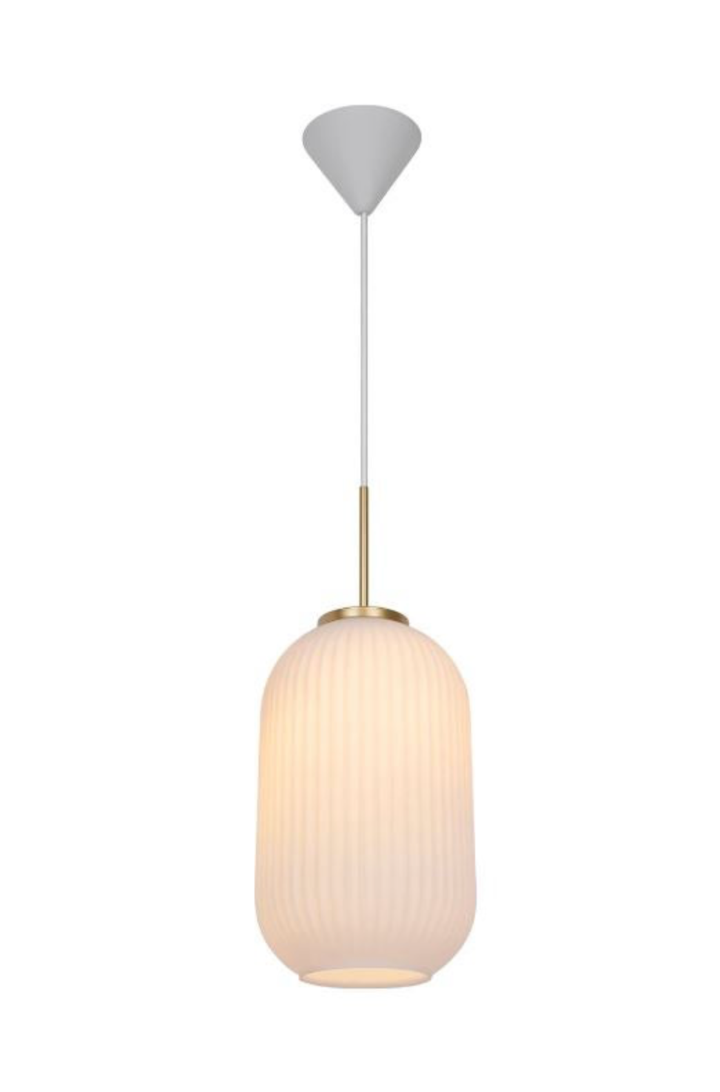Milford is a decorative series, where the opal white mouth blown glass creates a soft and almost "pleated" look. The design is classic and vintage, balanced with a modern twist of the brass suspension. The combination of the organic forms and the grooved surface creates elegance and illuminates the room with a soft and warm light.