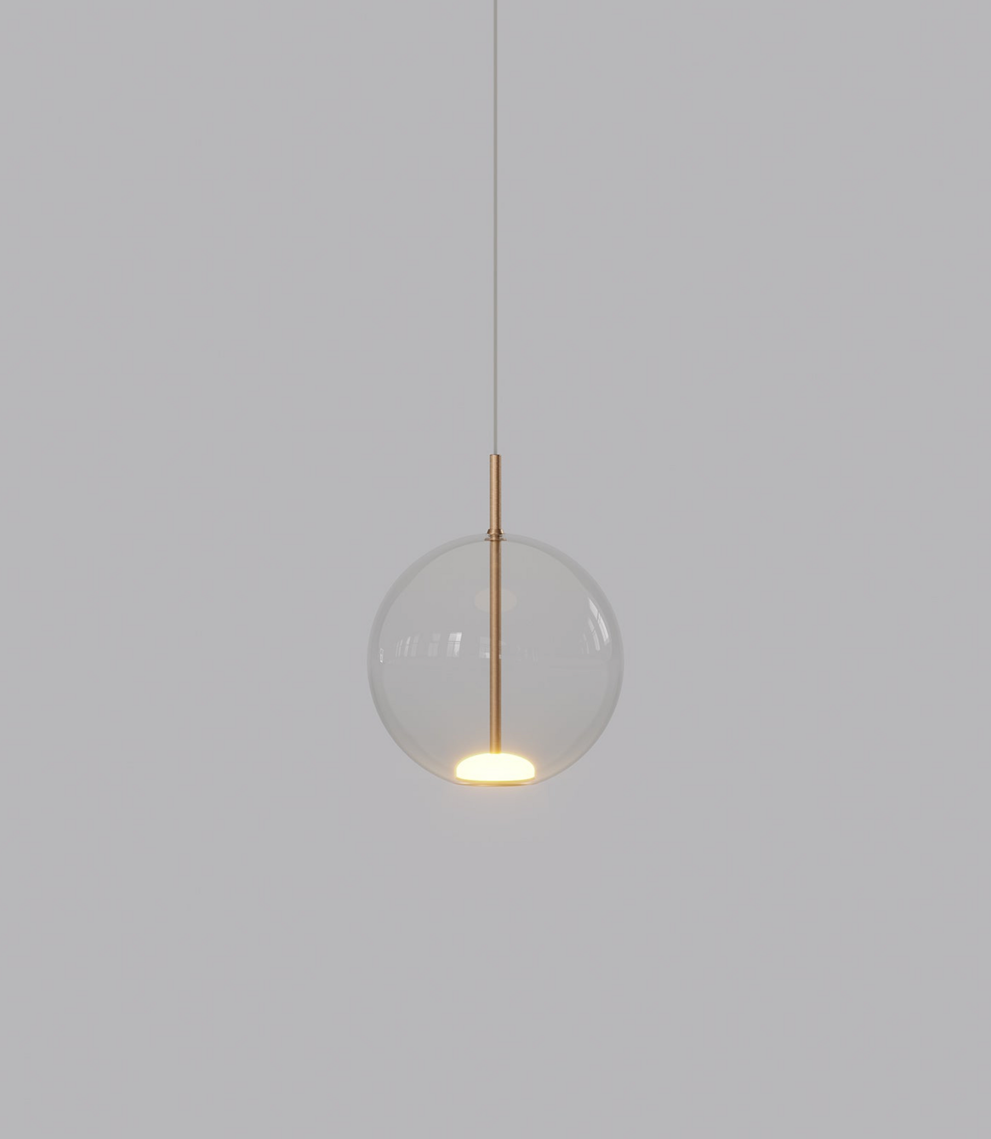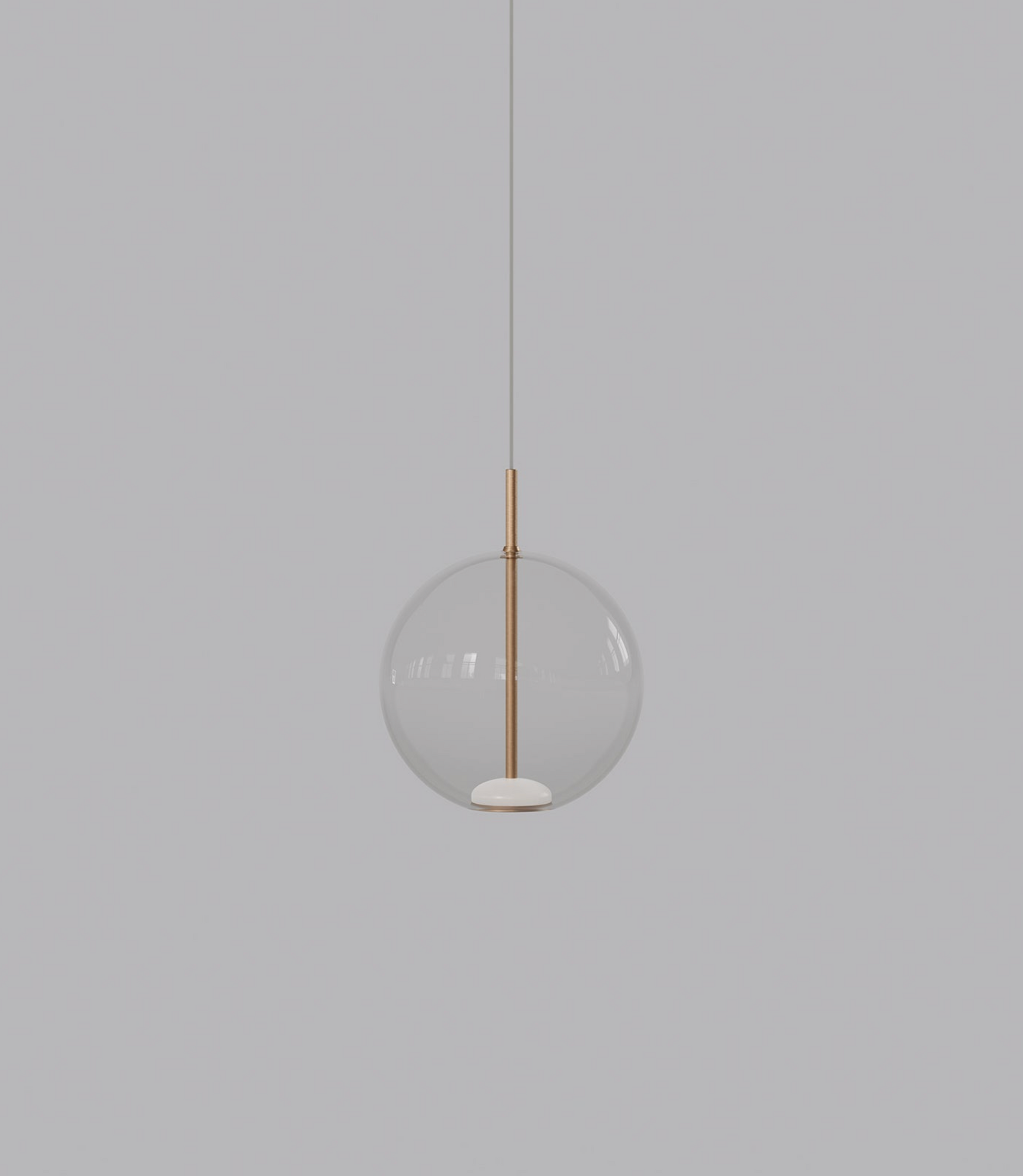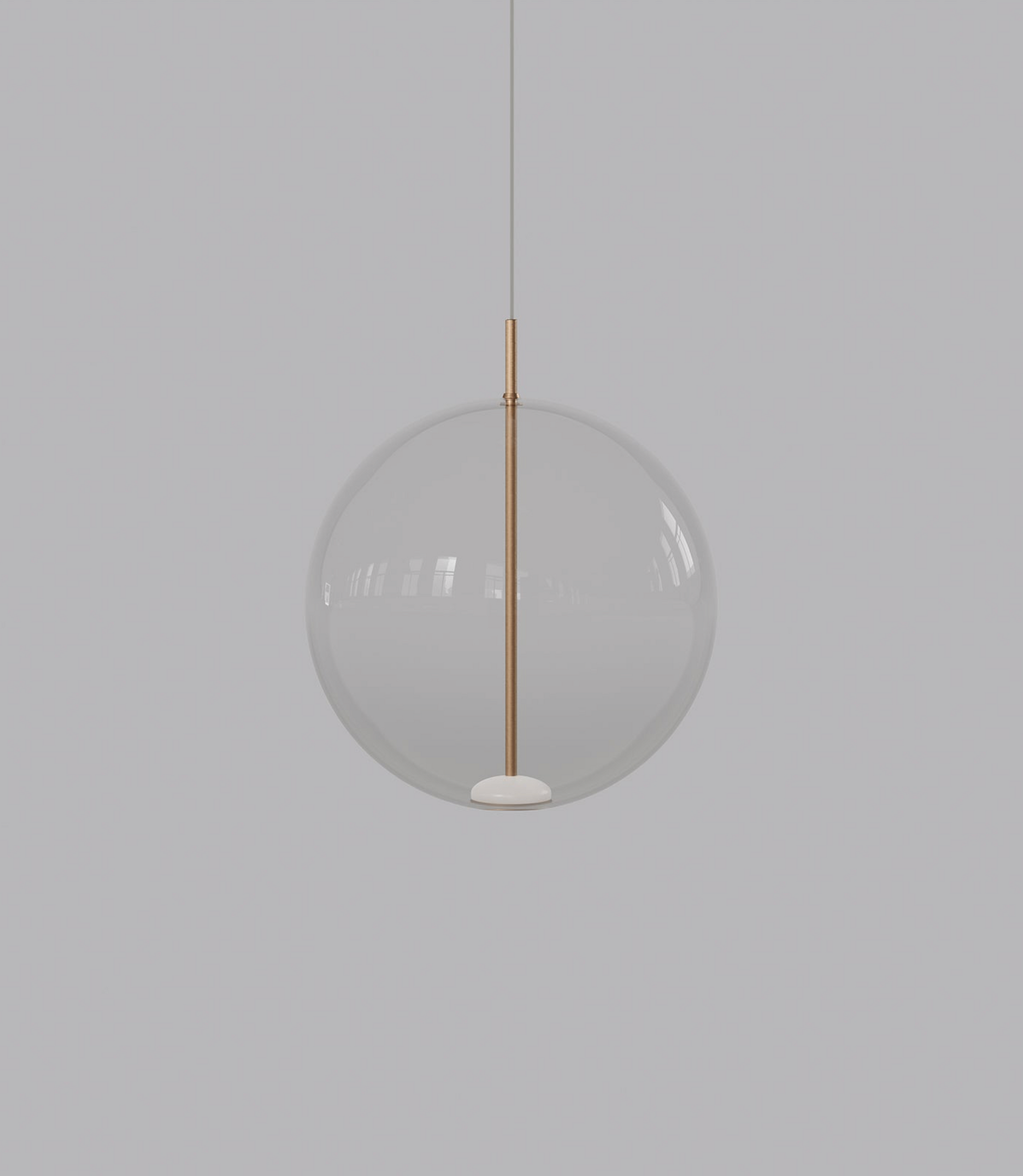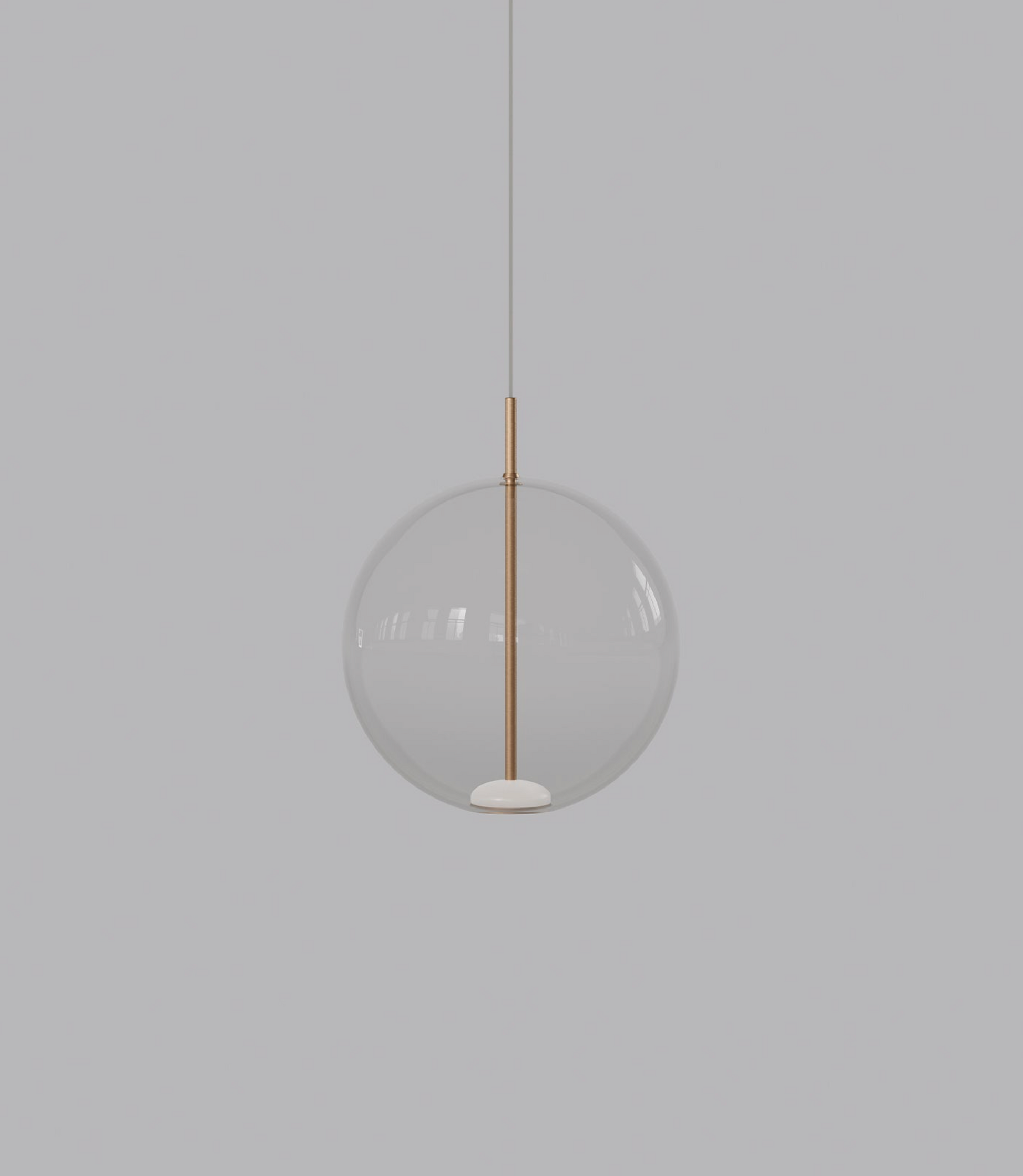 Orb Air Pendant Light showcases a borosilicate glass sphere, meticulously crafted to evoke a sophisticated weightlessness. A refined brass rod intersects the sphere, housing a radiant dimmable LED light source. Orb Air’s familiar yet captivating form emanates a celestial ambience, providing the perfect fusion of contemporary aesthetics and timeless elegance.