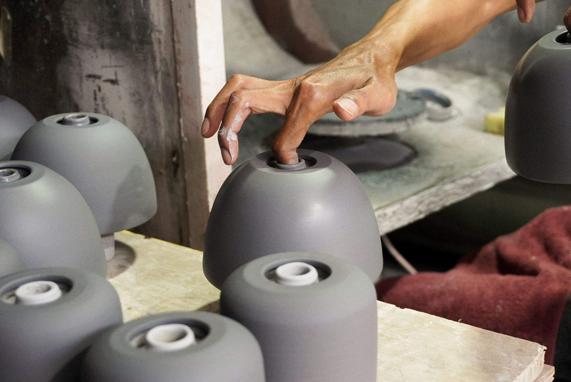 Crafted with a combination of two contrasting half domes, Terra 00 is available in pendant light, wall and ceiling mounted formats. The Terra 00 Pendant Light is made up of a slip-cast ceramic shade, paired with hand-turned FSC certified timbers, making a modern form that brings two elements together. The handmade nature of each component means it is infused with subtle variations before being fired. The Terra range is our largest range, with a wide mix of variations that all bring a uniquely handmade approach together.